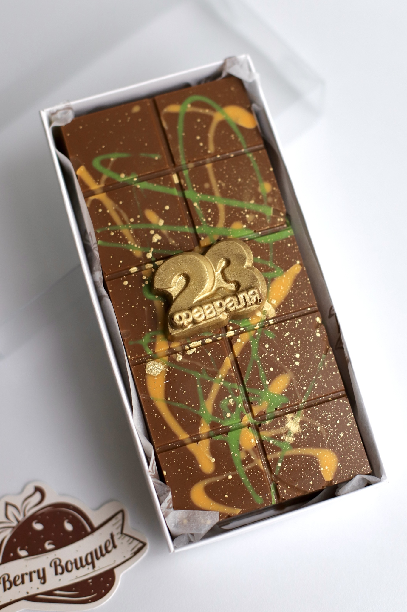 Представляем уникальный подарок к празднику всех защитников – дубайский шоколад "23 Февраля" с сочной фисташкой! Этот роскошный десерт создан специально для настоящих мужчин, ценящих насыщенный вкус и безупречное качество. Молочный бельгийский шоколад от знаменитого бренда Callebaut гармонично сочетается с ароматной фисташковой пастой, придавая лакомству восточную нотку. Нежнейшее тесто катаифи добавляет текстурную утонченность, а завершает композицию легкий акцент дробленых фисташек и яркого декора из пищевой позолоты. Это идеальный выбор для тех, кто хочет удивить своих близких оригинальным подарком, полным любви и внимания. Почувствуйте истинное наслаждение вместе с этим восхитительным шоколадом!
