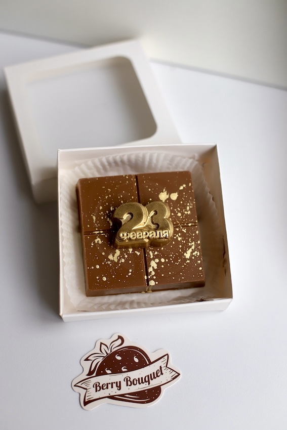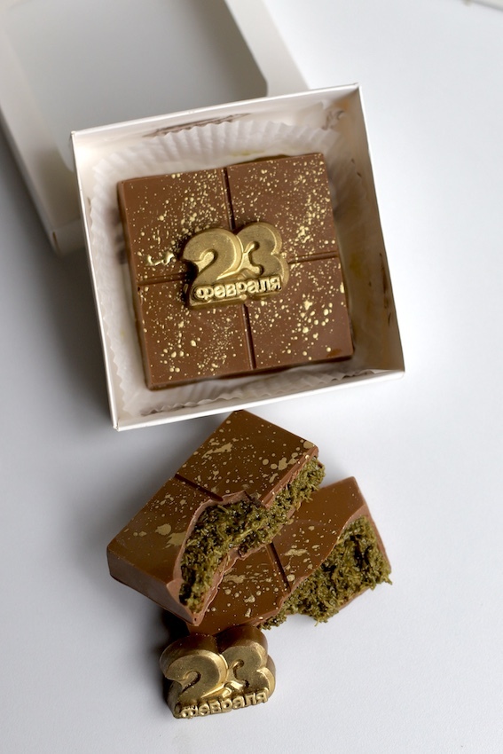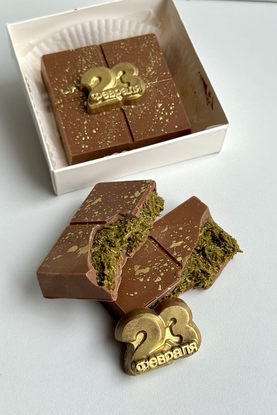 Представляем уникальный подарок к празднику всех защитников – дубайский шоколад "23 Февраля" с сочной фисташкой! Этот роскошный десерт создан специально для настоящих мужчин, ценящих насыщенный вкус и безупречное качество. Молочный бельгийский шоколад от знаменитого бренда Callebaut гармонично сочетается с ароматной фисташковой пастой, придавая лакомству восточную нотку. Нежнейшее тесто катаифи добавляет текстурную утонченность, а завершает композицию легкий акцент дробленых фисташек и яркого декора из пищевой позолоты. Это идеальный выбор для тех, кто хочет удивить своих близких оригинальным подарком, полным любви и внимания. Почувствуйте истинное наслаждение вместе с этим восхитительным шоколадом!