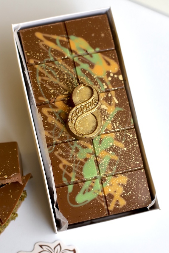 Состав: молочный бельгийский шоколад Callebaut, натуральная фисташковая паста, хрустящее тесто катаифи, дробленая фисташка, кандурин.