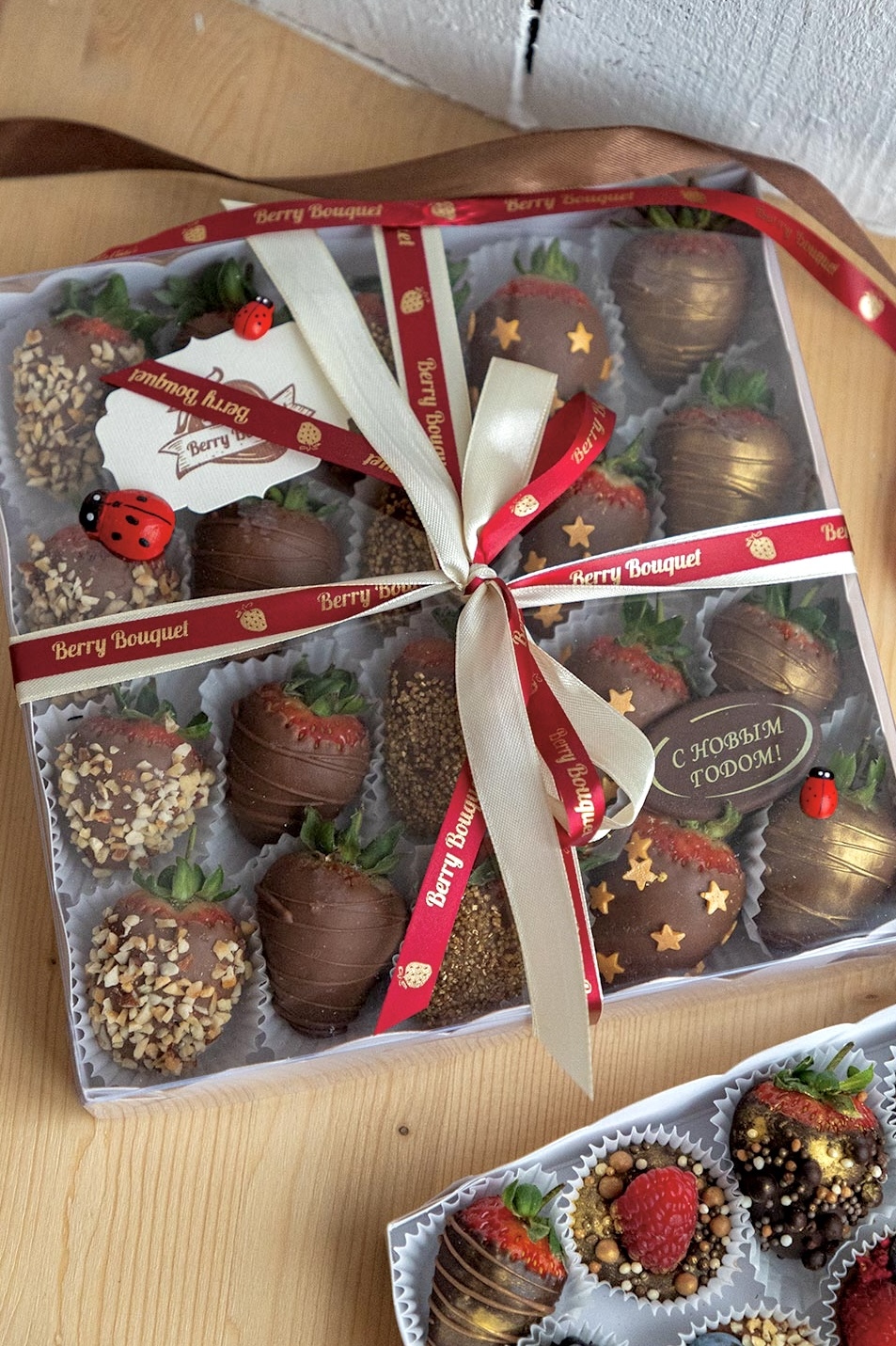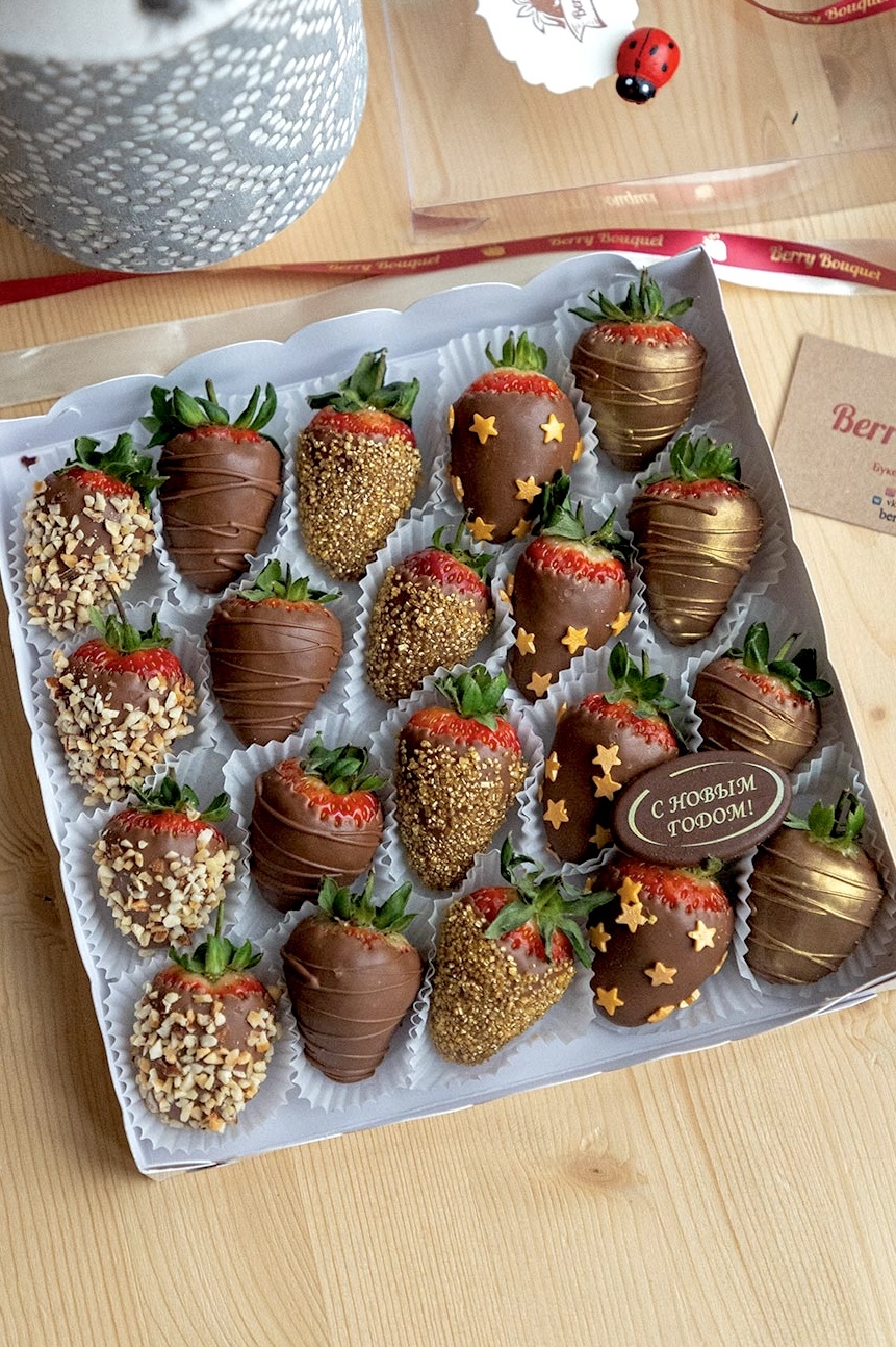 Набор "Золотое мерцание" – это настоящее произведение искусства! Нежная, сочная клубника, окутанная мягким молочным бельгийским шоколадом Callebaut, превращается в настоящий деликатес благодаря изысканному декору. Пылкие искры золотых кондитерских посыпок сверкают на каждой ягодке, даря ощущение праздника. Хрупкие ореховые крошки добавляют текстурный контраст, а аппетитные капли настоящего пищевого золота завершают образ этого кулинарного шедевра. Выберите этот набор для особого случая, чтобы добавить блеска и радости вашему празднику!