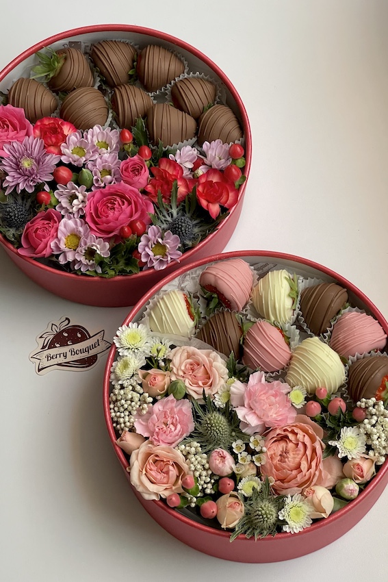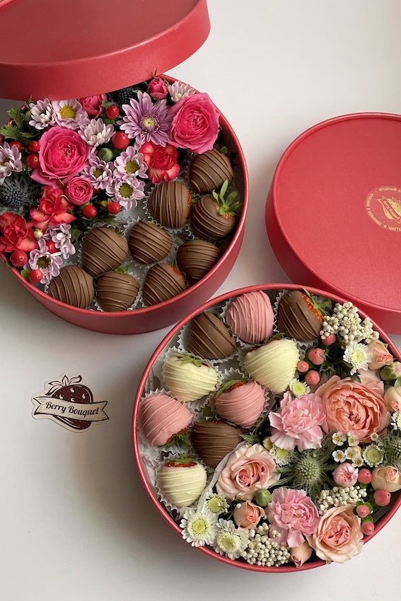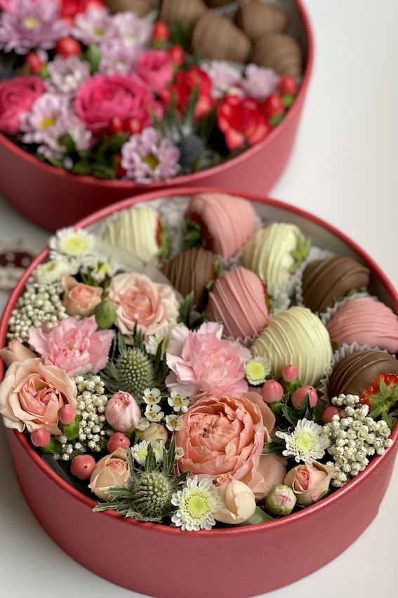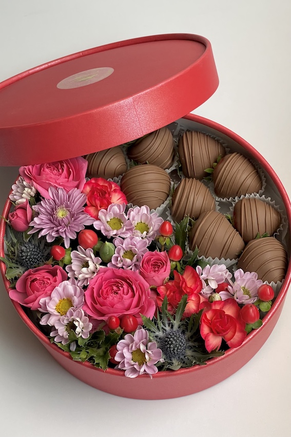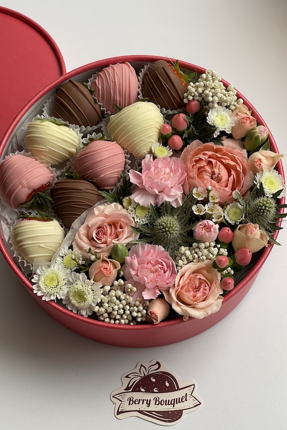 Букет из цветов и клубники в бельгийском шоколаде Callebaut в круглой подарочной коробке. Два варианта оформления на выбор: в молочном шоколаде или ассорти три шоколада (молочный, белый, розовый)