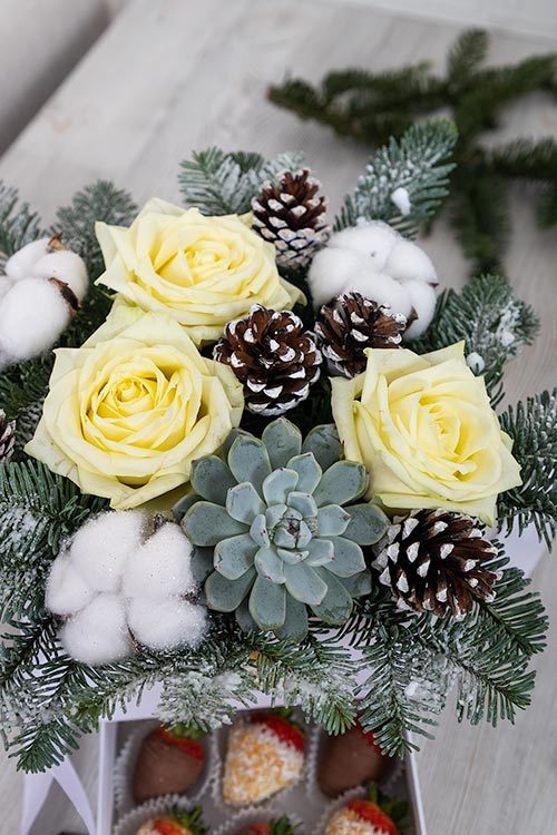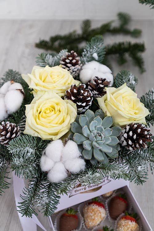 Откройте для себя волшебство зимней природы с нашей уникальной шкатулкой «Зимний лес». Вдохновленный красотой заснеженных лесов дизайн сочетает белые розы и нобилис, декоративные шишки, суккуленты и хлопок — всё это создаёт атмосферу зимнего уюта и гармонии. Идеальный подарок близким людям или украшение вашего интерьера!