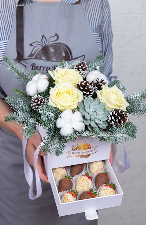 Шкатулка с зимней композицией и свежей клубникой в бельгийском шоколаде Callebaut - уникальный презент даже для самого изысканного получателя