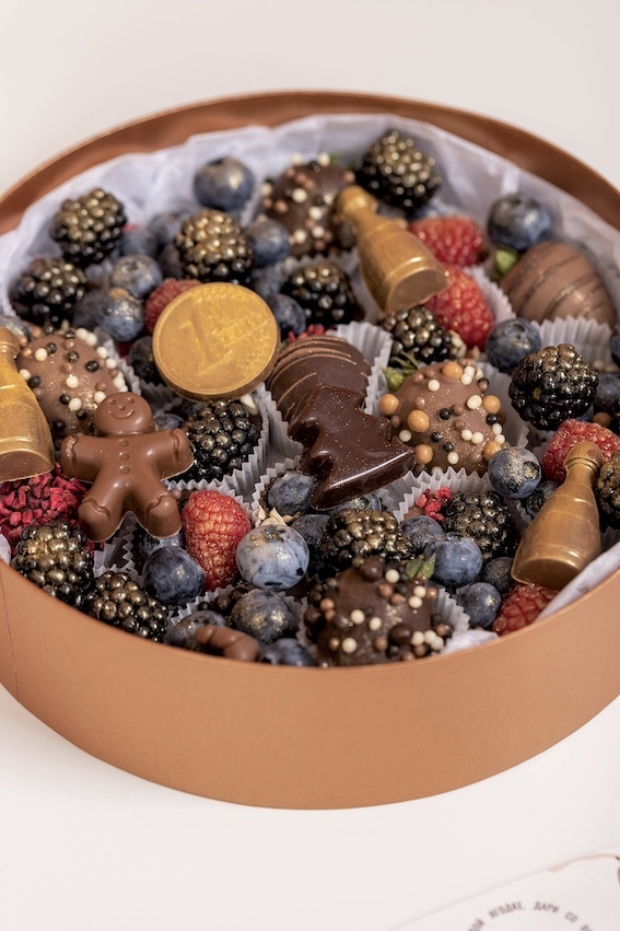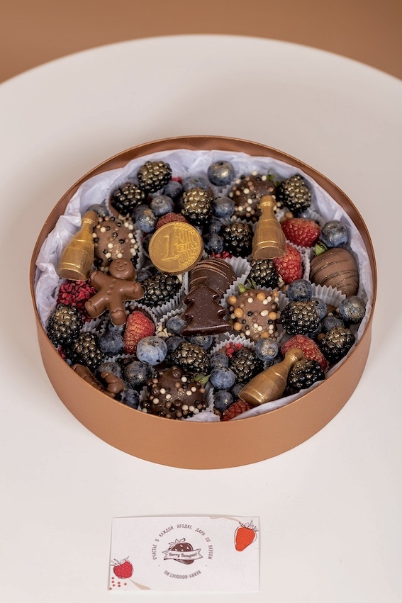 Круглый бокс «Роскошное ассорти» – это настоящее произведение искусства, сочетающее самые вкусные и полезные ингредиенты. В составе клубника в темном и молочном шоколаде, конфетки ручной работы с ягодками малины, голубики и ежевики. Изюминку придают кондитерские позолоченные элементы и разнообразные посыпки: хрустящие шарики, сублимированная малина и дробленный миндаль. А оригинальные формы конфет – елочка, человечек, бутылочка и монета из бельгийского шоколада – удивят даже самых искушенных гурманов! Настоящий праздник вкуса!