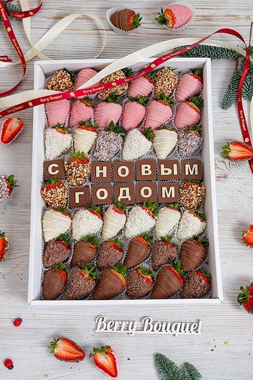 Порадуйте близких незабываемым вкусом! Наш набор клубники в шоколаде «С Новым Годом» – это свежайшая сочная клубника, покрытая премиальным бельгийским шоколадом Callebaut трех видов. Украшения из кокосовой стружки, молотого ореха, шоколадной крошки и яркого розового сахара создают праздничное настроение. А надпись из вкуснейших букв из молочного шоколада сделают подарок по-настоящему особенным. Создадим сладкие эмоции вместе!