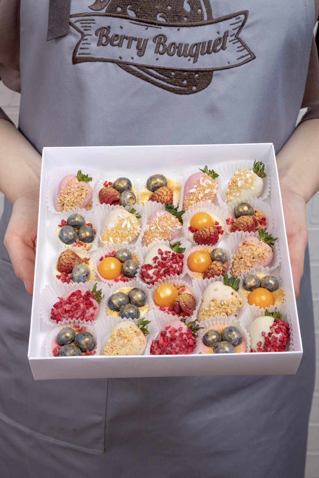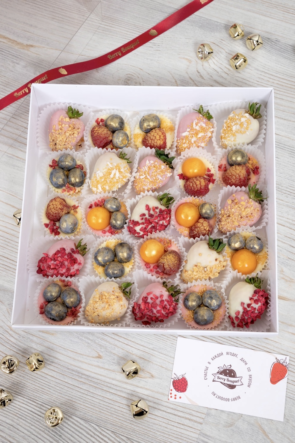 Рождественское ассорти - это великолепное сочетание свежих ингредиентов и элегантного оформления. В основе композиции лежит классический дуэт клубники в белоснежном и нежно-розовом бельгийском шоколаде Callebaut. Добавили в набор сочные ягодные конфеты, которые наполнят ваш вкус яркими нотками праздника! Сублимированная малина для дополнительной утонченной кислинки; хрустящие орехи, придающие блюду легкую текстурность; сладковатая кокосовая стружка и роскошный золотой сахар, который сверкает при свете гирлянд. Удвойте эффект праздника благодаря золотому напылению кондитерского кандурина. Попробуете этот шедевр кулинарного искусства, и насладитесь моментом совершенства вместе с близкими людьми за уютным рождественским столом!