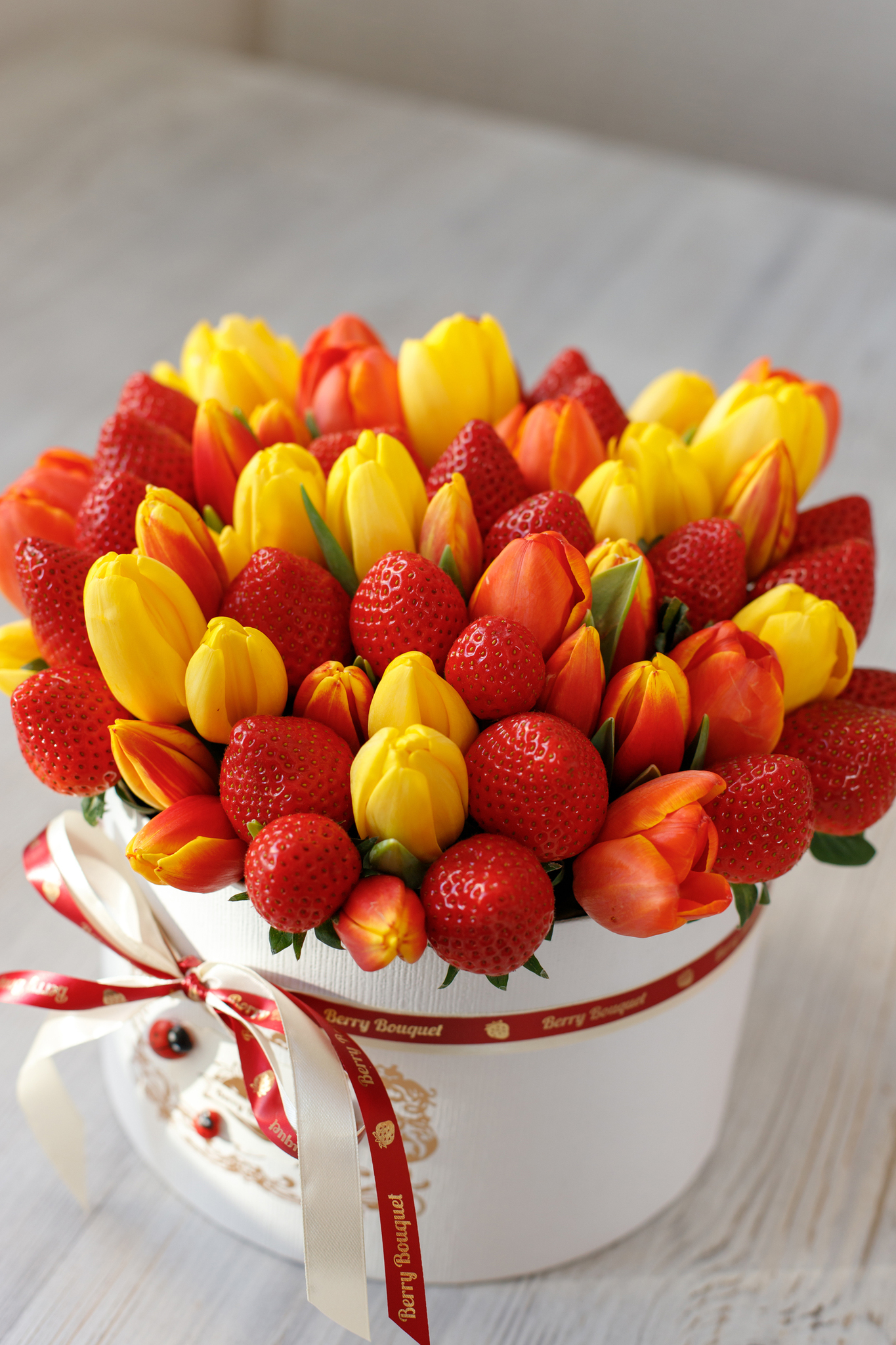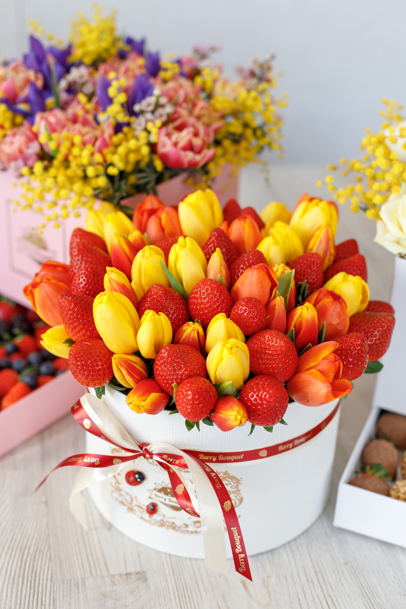 Представляем вашему вниманию шляпную коробку с весенней композицией из свежей клубники и разноцветных тюльпанов «Весенний сад». Это идеальное сочетание вкуса и красоты! В составе композиции – спелая сладкая клубника и яркие милые цветы, которые создадут атмосферу весны у вас дома или станут отличным подарком близким людям по любому поводу. Обратите внимание, что цвет и сорт цветов могут немного отличаться от представленных на фото. Порадуйте себя и своих близких этим замечательным презентом!