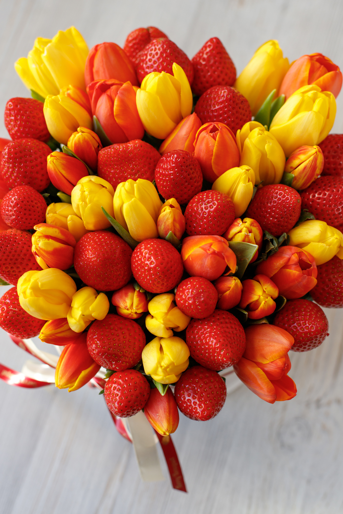 Коллекция тюльпанов ярких оттенков, собранная в единое целое со спелыми ягодами алой клубники.