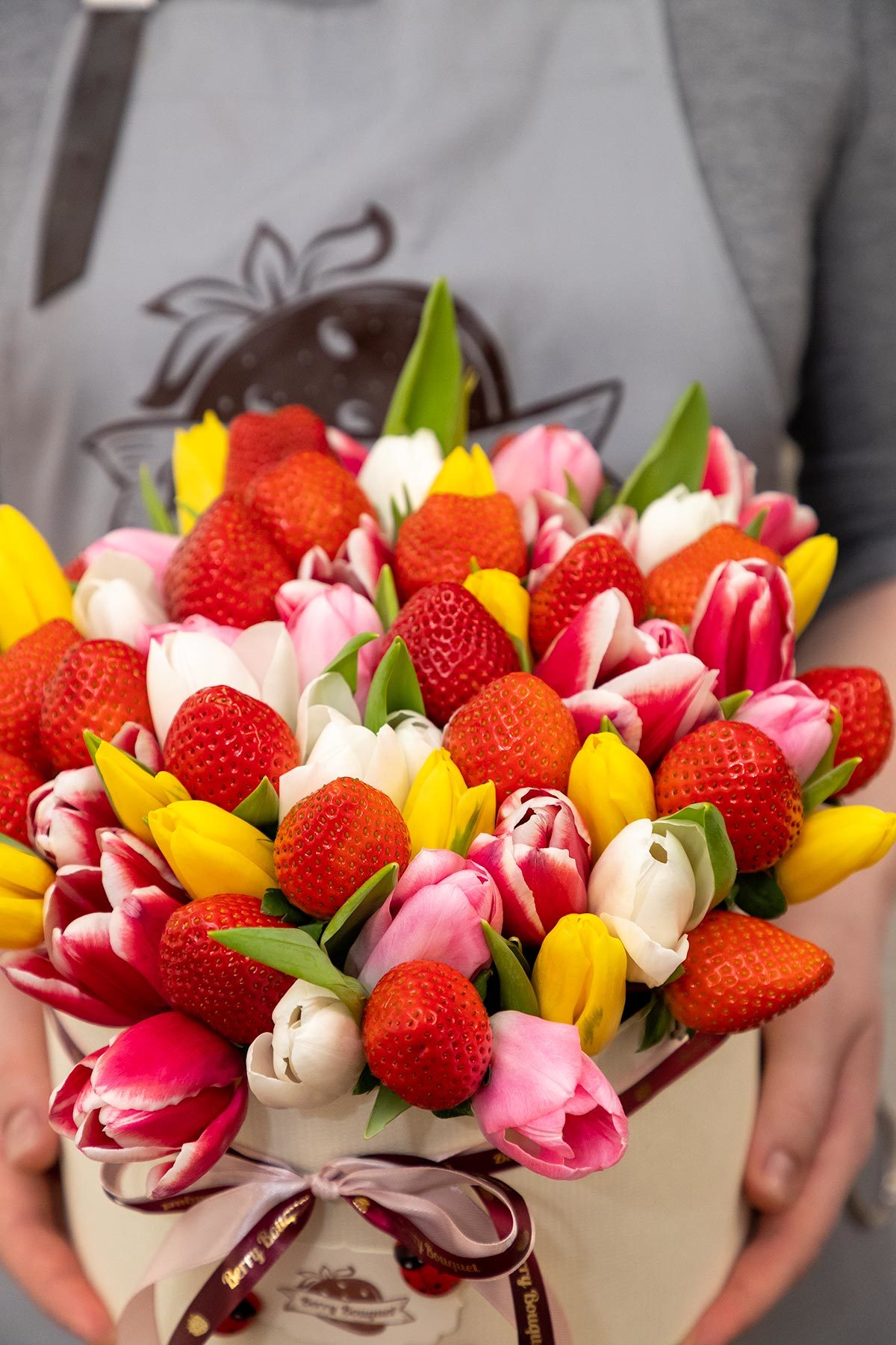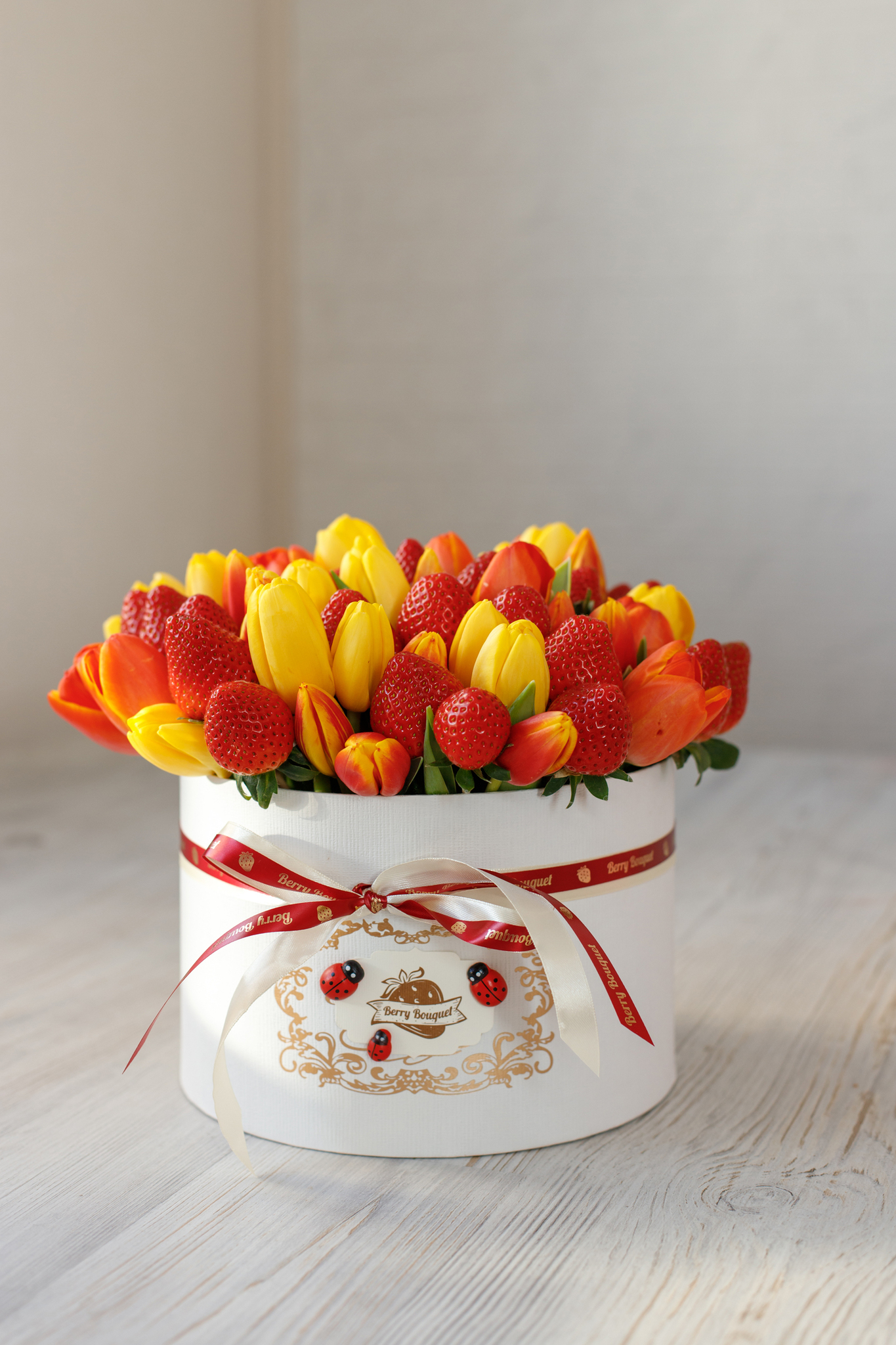 Шляпная коробка с клубникой и тюльпанами "Весенний сад"