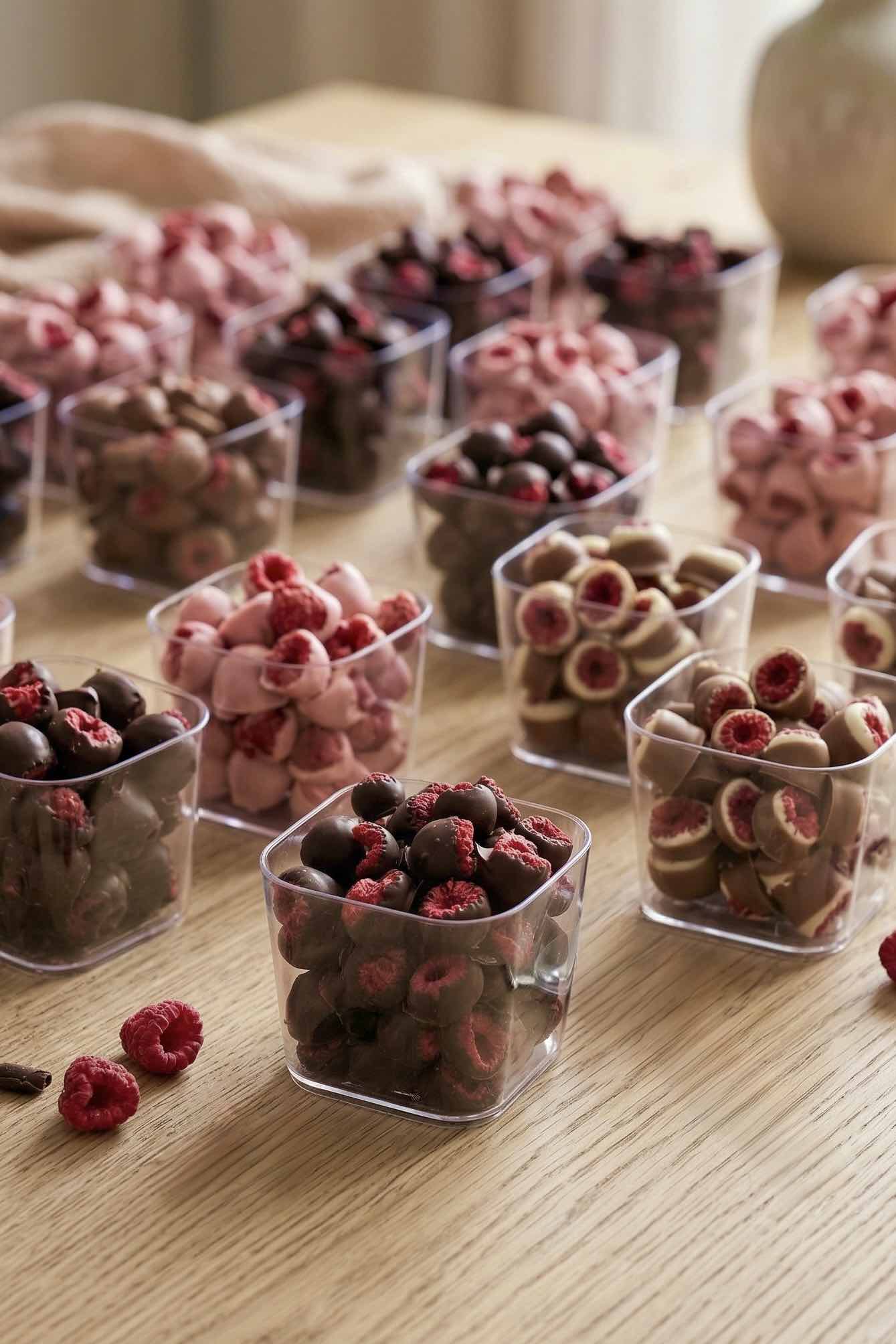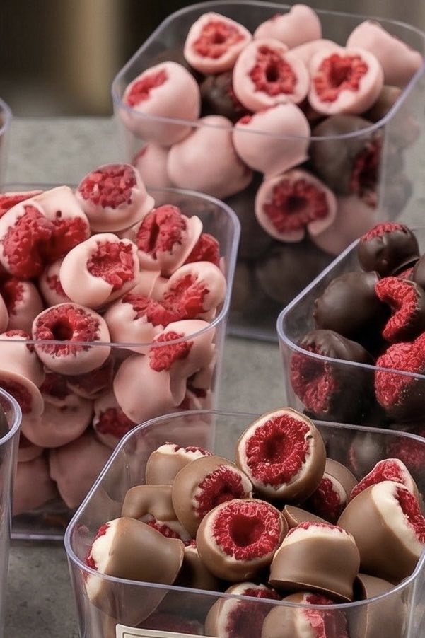 Состав: Сублимированная малина, Шоколад на выбор: Молочный и белый, Клубничный розовый, Темный.